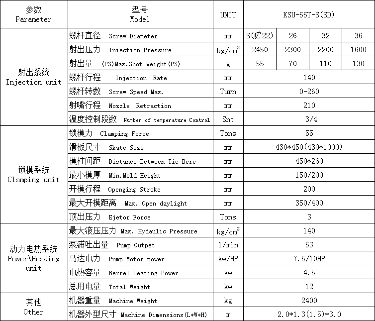 單滑板注塑機KSU-55T-S參數(shù):