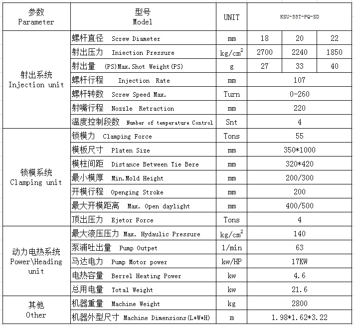 連接器雙滑板立式注塑機(jī)KSU-55T-PQ-SD參數(shù):