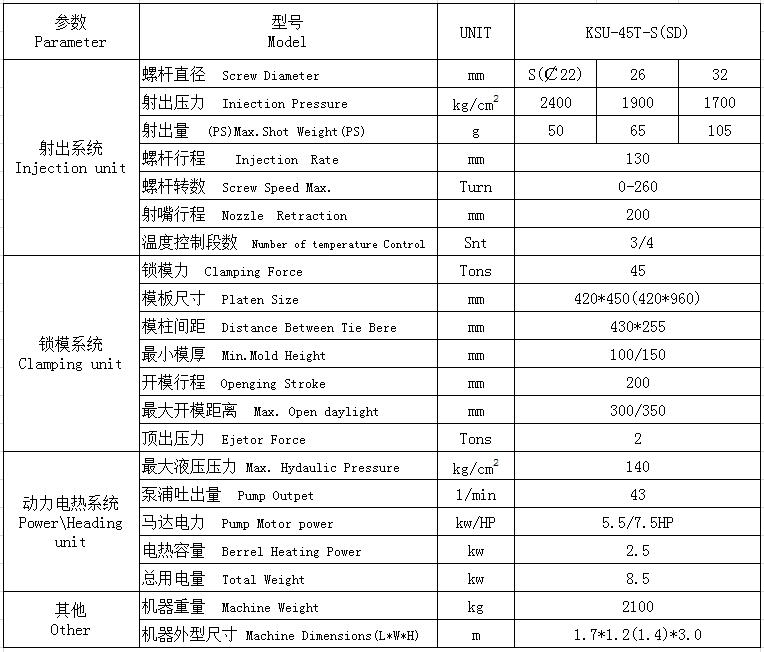 粉末冶金/陶瓷單滑板注塑機(jī)KSU-45T-S參數(shù):